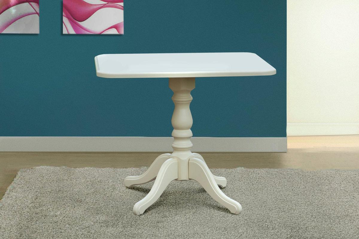 Розмір: 900*680, h: 735 Колір: Білий, Матеріал: Каркас: масив дерева; Столешня: шпонований дубом МДФ Моно - не розсувний стіл для вітальні з натурального дерева з елегантною точеною ніжкою. Торці столу красиво зафрезовані та пофарбовані. Столик виготовлений з масиву натурального дерева (каркас та ніжки). Стільниця виготовлена з плити МДФ, покритої шпоном.